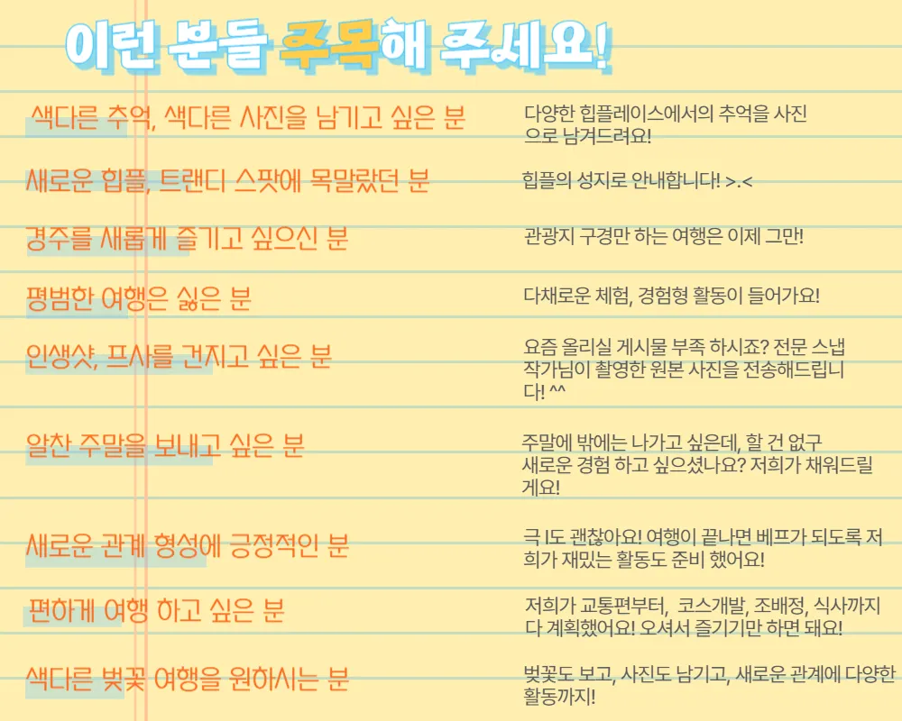 취향이 비슷한 또래들과 경주의 힙플을 구석구석을 돌아볼 수 있는 여행이에요!