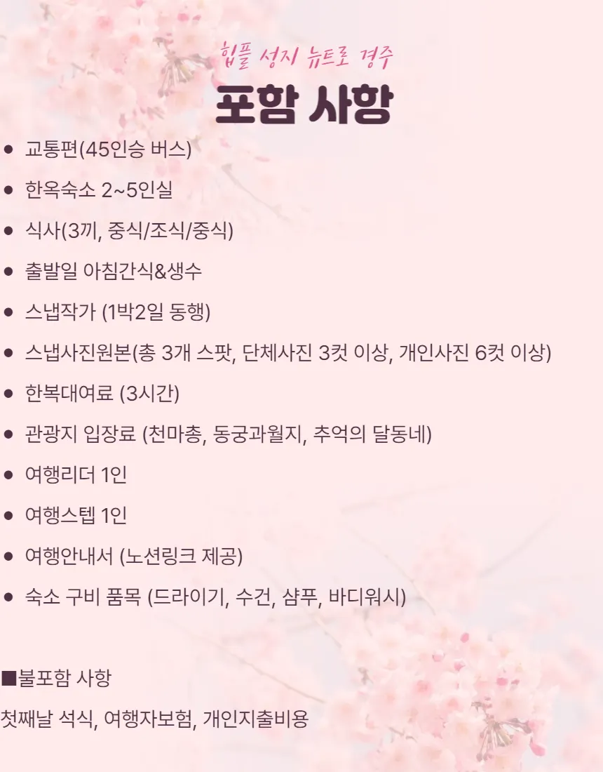 스냅작가(1박2일 동행), 스냅사진(원본 사진 제공: 총3개 스팟, 단체사진 3컷 이상, 개인사진 6컷 이상) ,전통한옥 숙소 (2인1실~5인 1실), 한복대여(3시간), 교통편(45인승 버스), 입장료(천마총, 동궁과월지, 추억의달동네), 불국사방문, 대릉원방문, 식사(3끼: 첫날중식, 둘째날 조식/ 중식), 여행리더 1인, 여행스텝1인, 첫날 아침 간식/생수, 여행안내서(노션링크), 숙소구비품목(드라이기, 수건, 샴푸, 바디워시)
