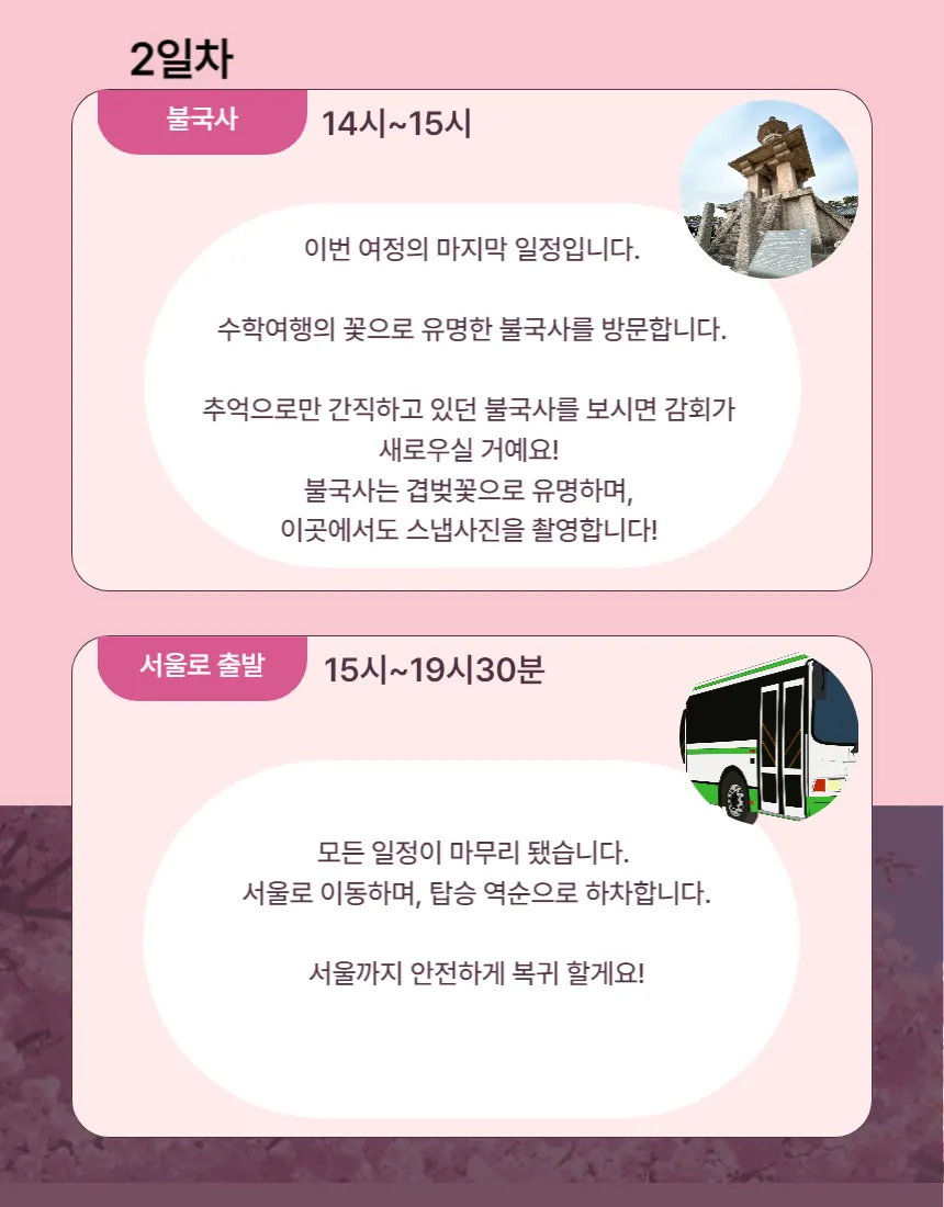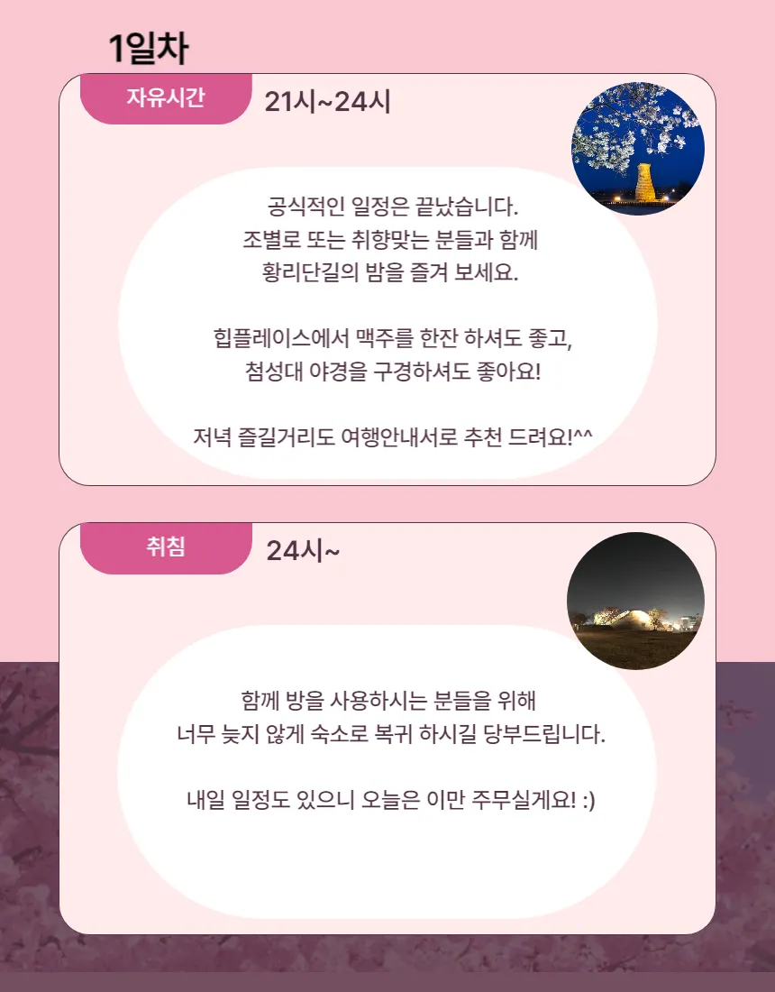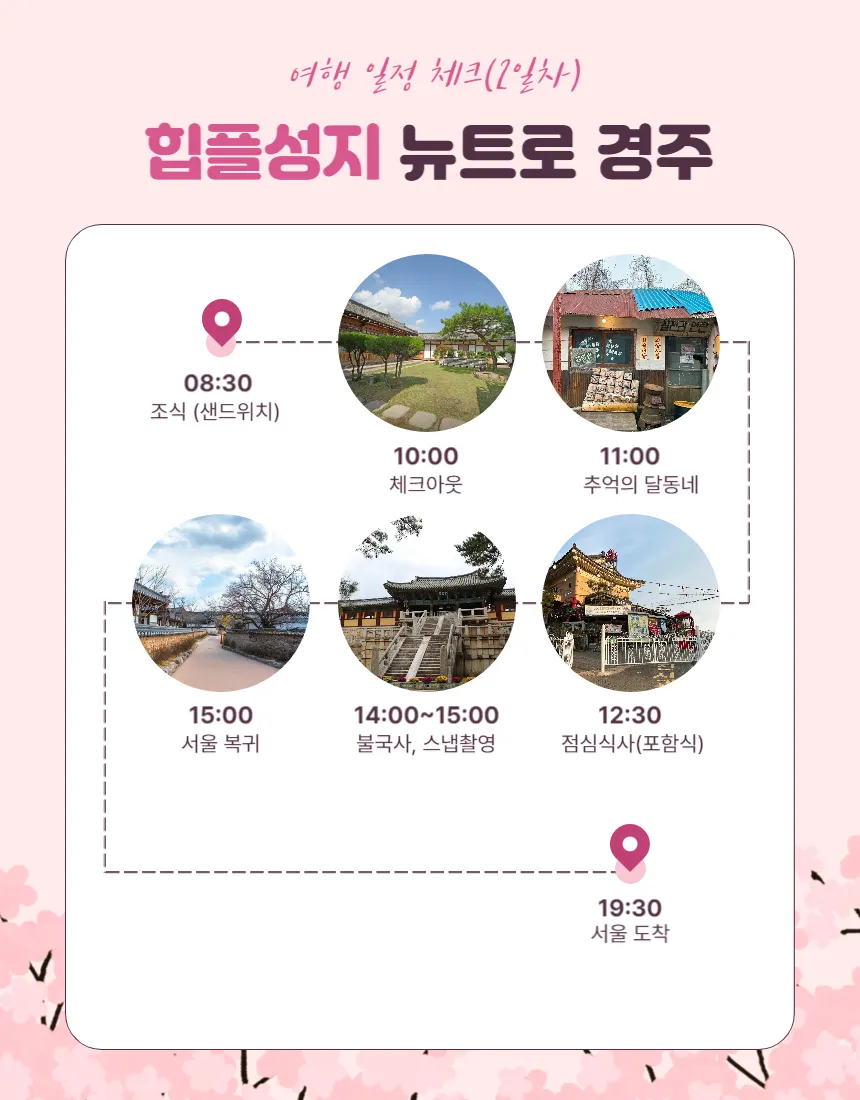 (대릉원, 천마총, 첨성대, 동궁과월지, 교촌마을, 월정교, 불국사 방문 예정)