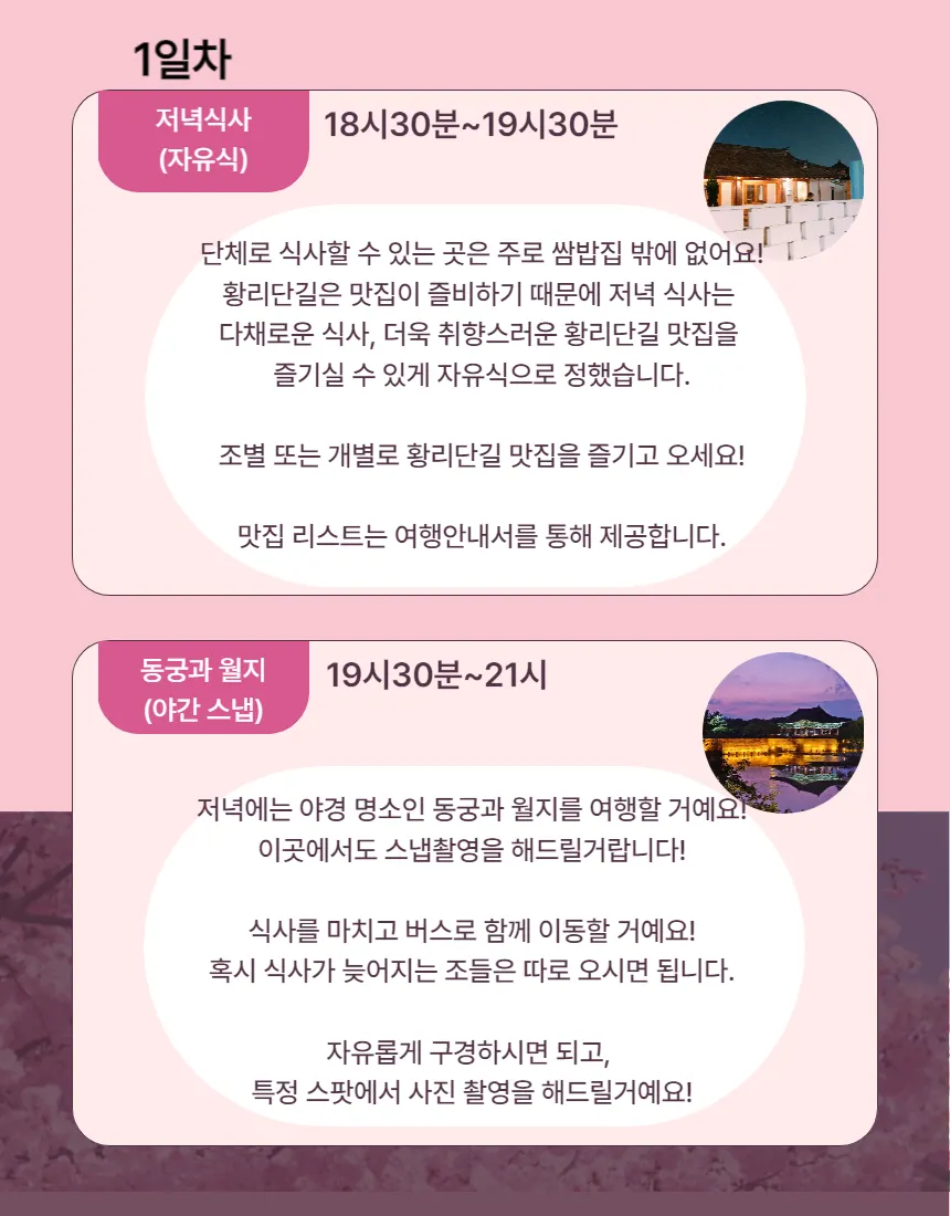 친구와 함께 따로 여행하고 싶으신 분들, 혼자 조용히 여행하고 싶으신 분들은 따로 또 같이 여행으로 신청해 주시면 됩니다. ^^ (스냅사진과 포함식사는 동일하게 제공됩니다.)
