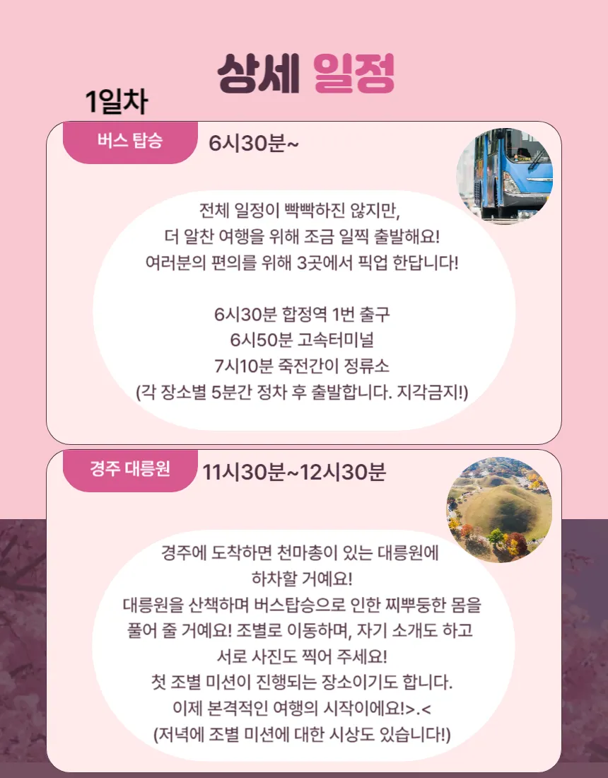[따로 또 같이] 도입!!!! '따로 또 같이'는 버스와 숙소, 전 일정은 함께 하되, 자유여행 시간에 조별 활동이 아닌 개별 여행을 하는 방식입니다.