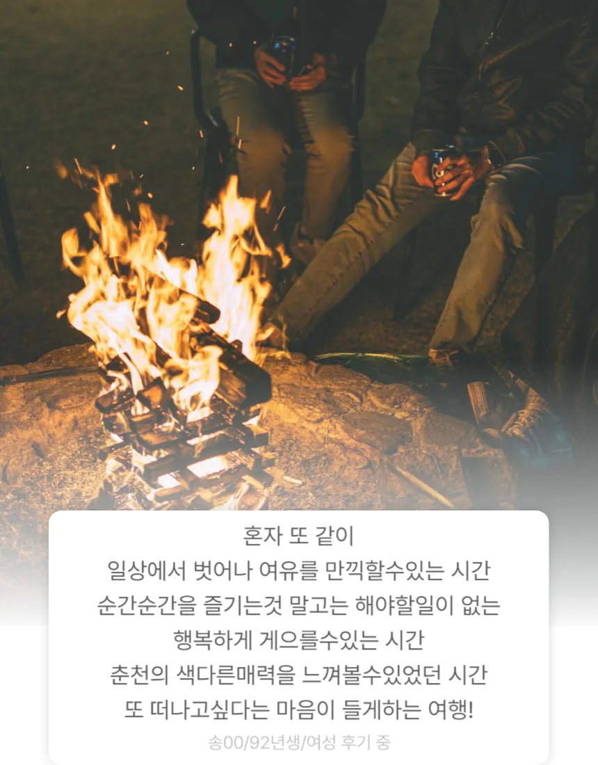 타 들어가는 장작을 보며 멍 때리기도 하고 진솔한 얘기도 나누며 여행의 낭만을 즐겨보세요!