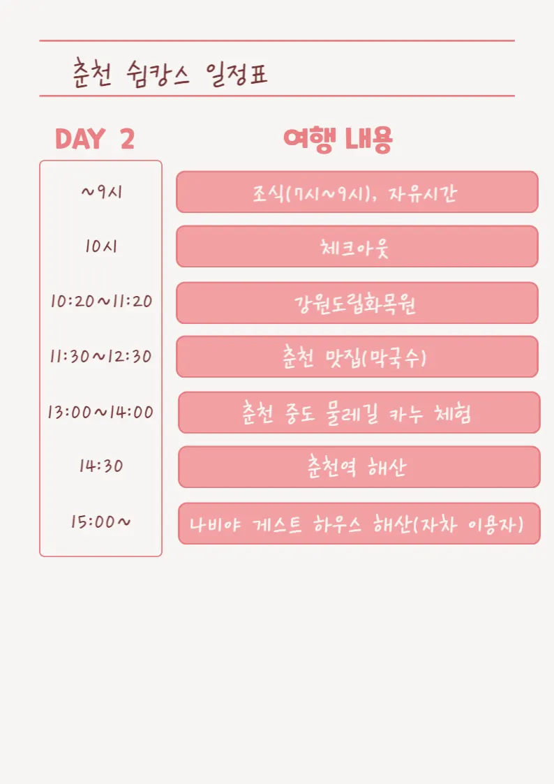 첫 날에는 각자의 여행을 즐기고, 둘째 날에는 대절 버스를 함께 타고 편하게 춘천 여행을 할 거예요!