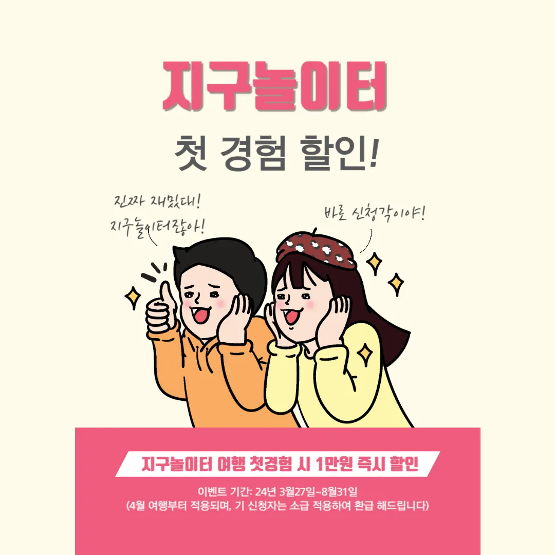 ์ง๊ตฌ๋์ดํฐ ์ฌํ์ ์ฒซ๋ฐฉ๋ฌธ ํ์ ๋ถ๊ป๋ ํด๋น ์ฌํ์ 1๋ง์ ํ ์ธ ํด๋๋ฆฝ๋๋ค!