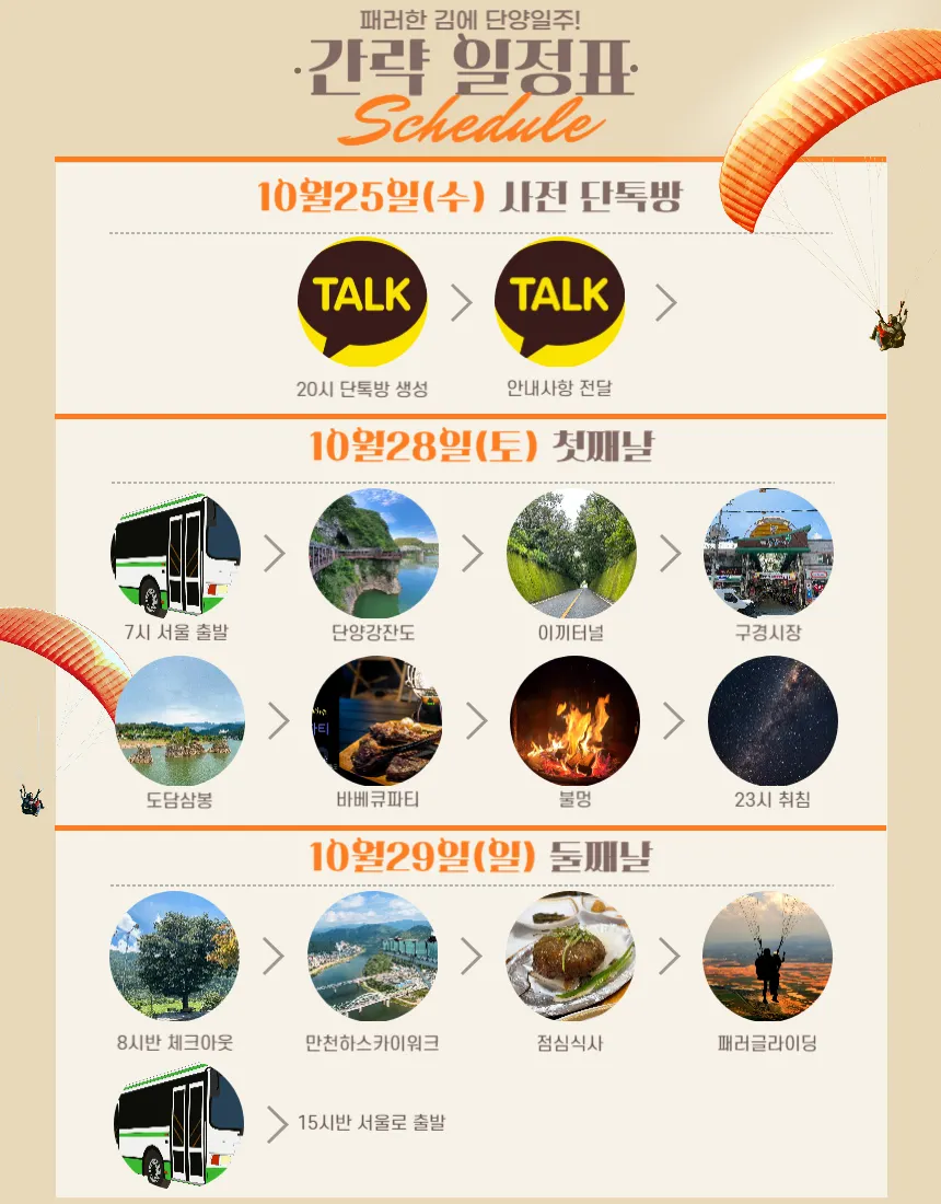 패러글라이딩 + 자연감상(feat. 단풍) + 바베큐파티+ 조별게임+ 액티비티(짚와이어,모터보트 등)