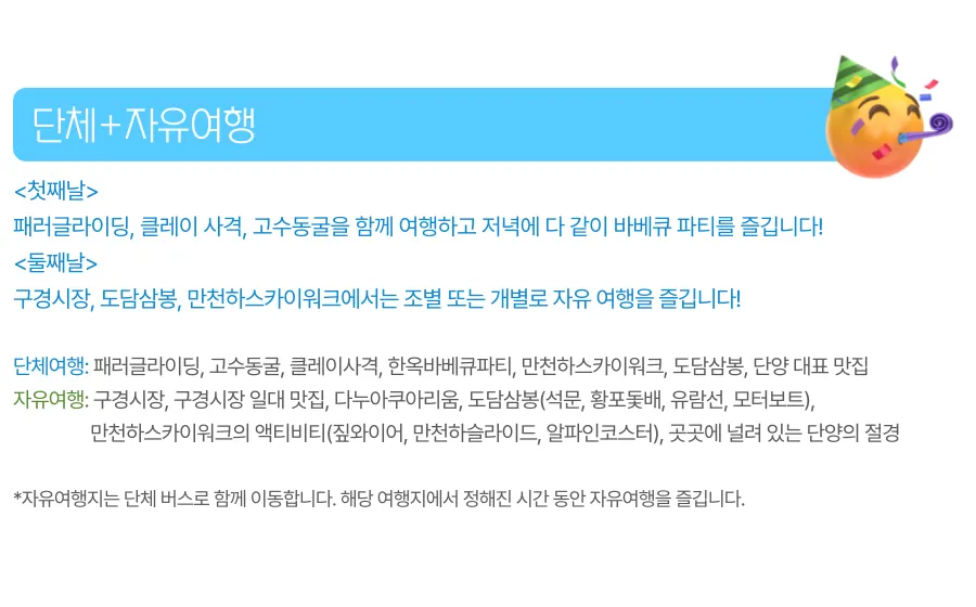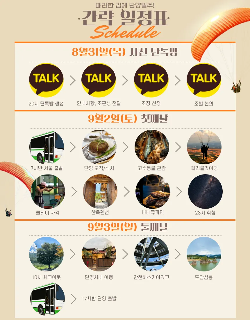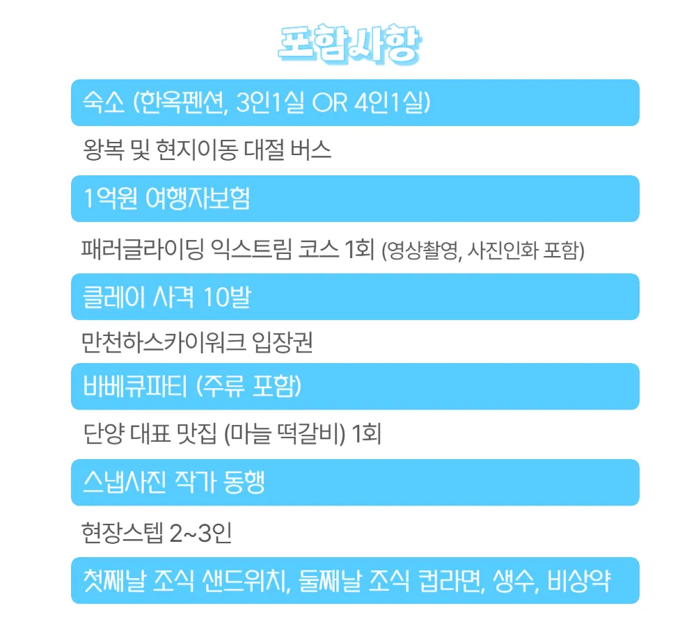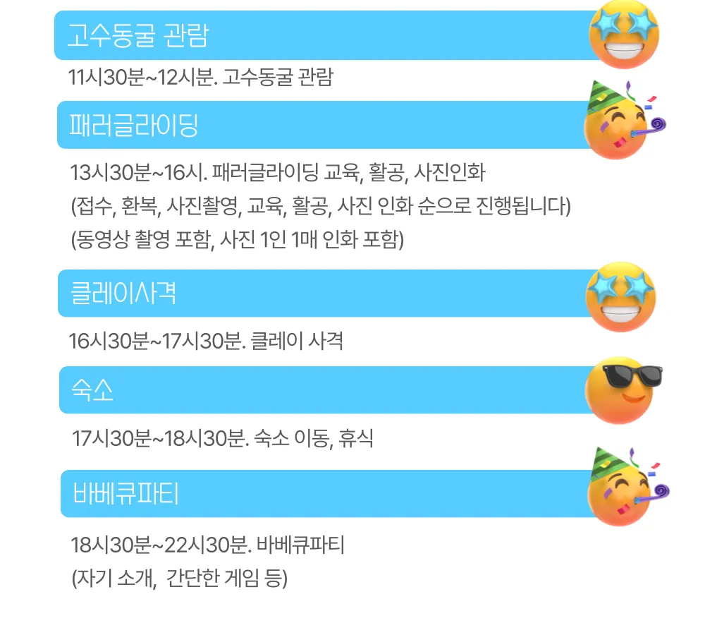 단양대표 맛집 식사→고수동굴 관람→ 패러글라이딩 체험→ 클레이사격→ 한옥 펜션 바베큐 파티