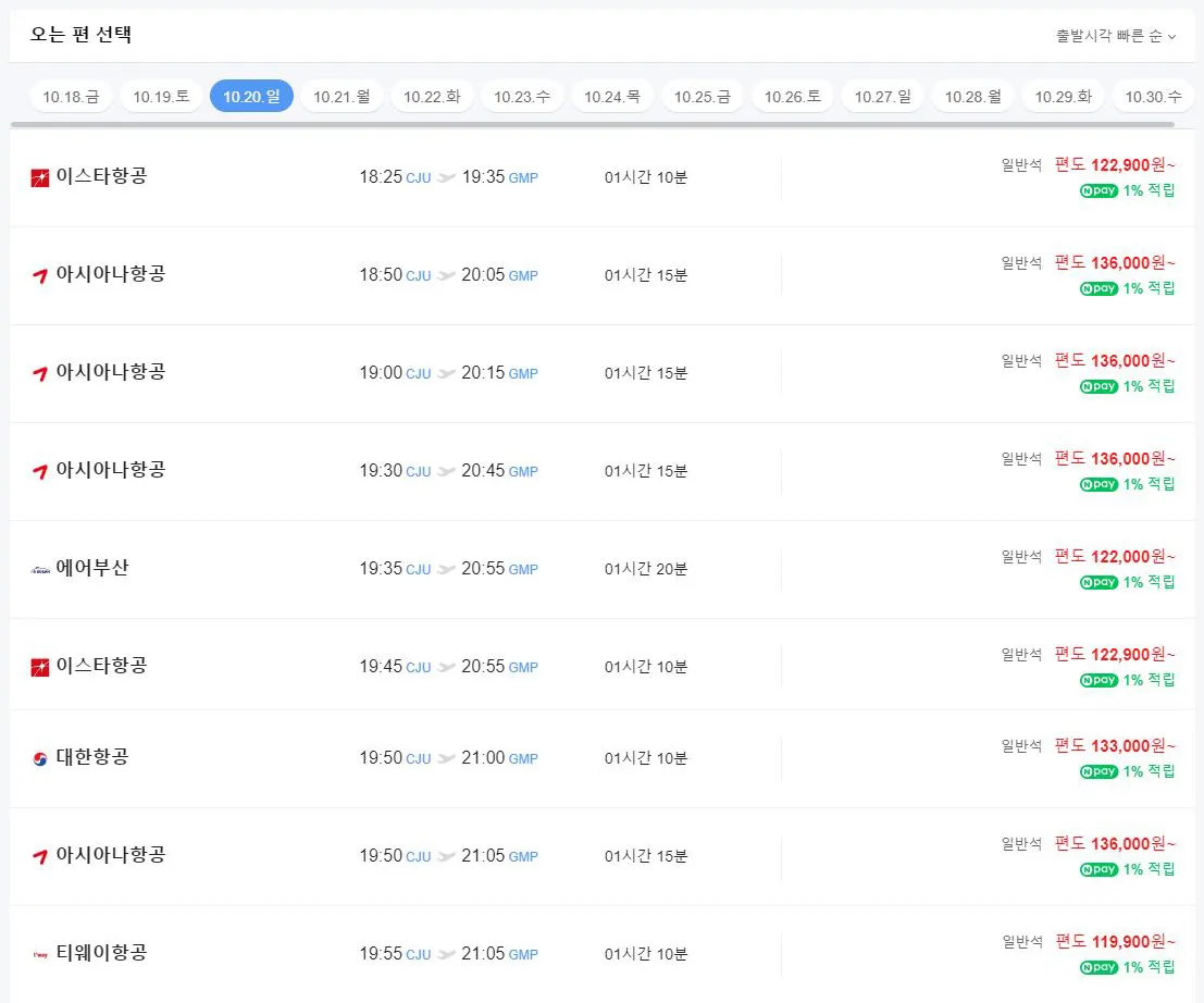 10์18์ผ(๊ธ) 11์35๋ถ ๊นํฌ์ถ๋ฐ, 10์20์ผ(์ผ) 20์50๋ถ ์ ์ฃผ์ถ๋ฐ. (์๋ณต์ด์ 24๋ง3์ฒ์)