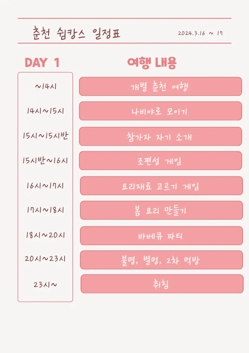 당일 상황에 따라 다른 일정으로 변경될 수도 있어요!
