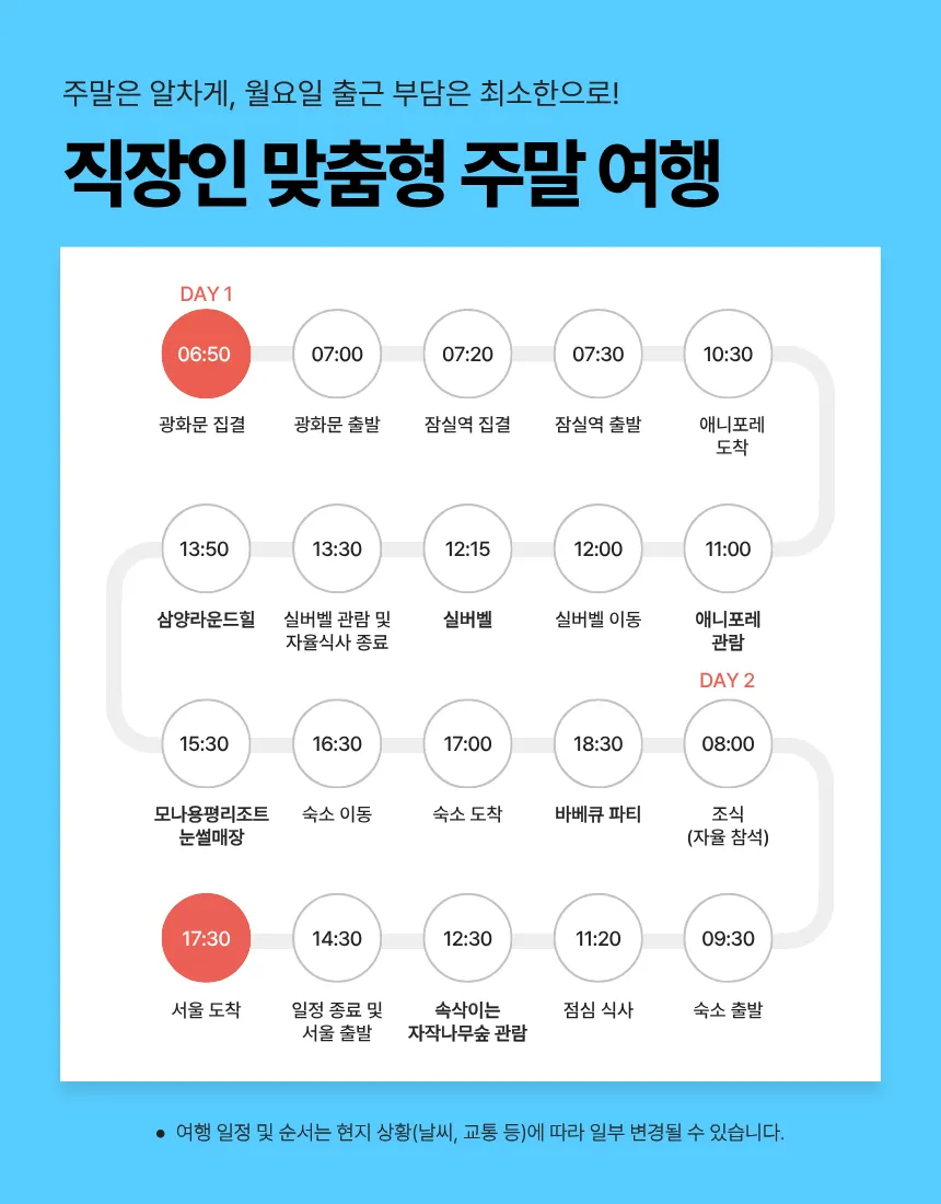 여행 일정 및 순서는 현지 상황(날씨, 교통 등)에 따라 일부 변경될 수 있습니다.