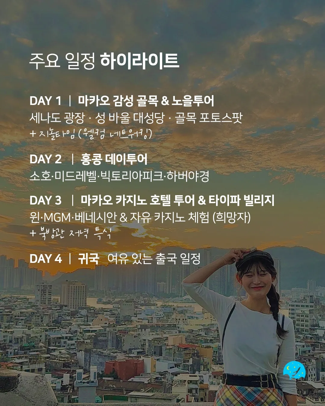 ์ถ๊ตญ(1์ผ์ฐจ) : ์ธ์ฒ 11:00 โ ๋ง์นด์ค 14:20