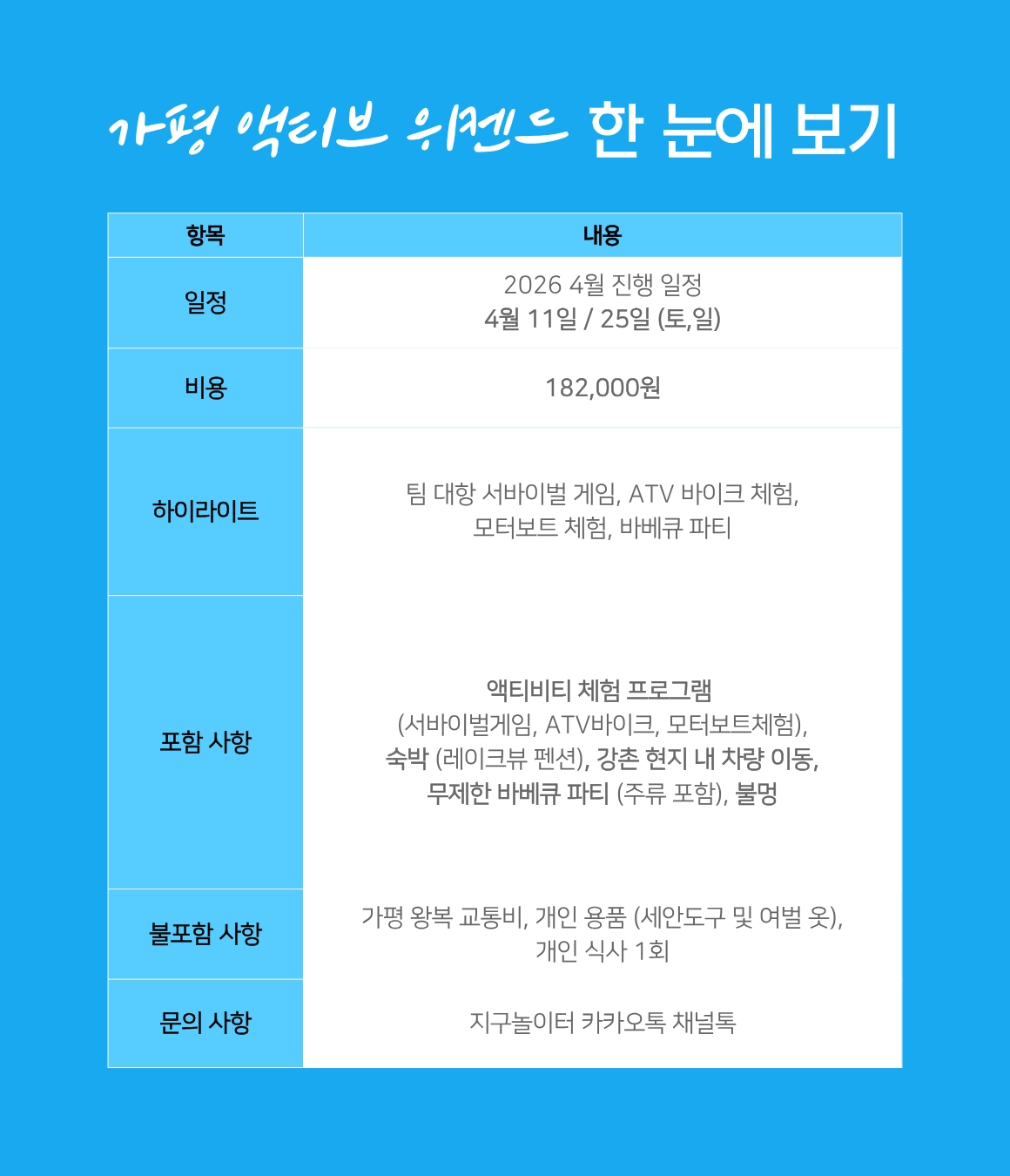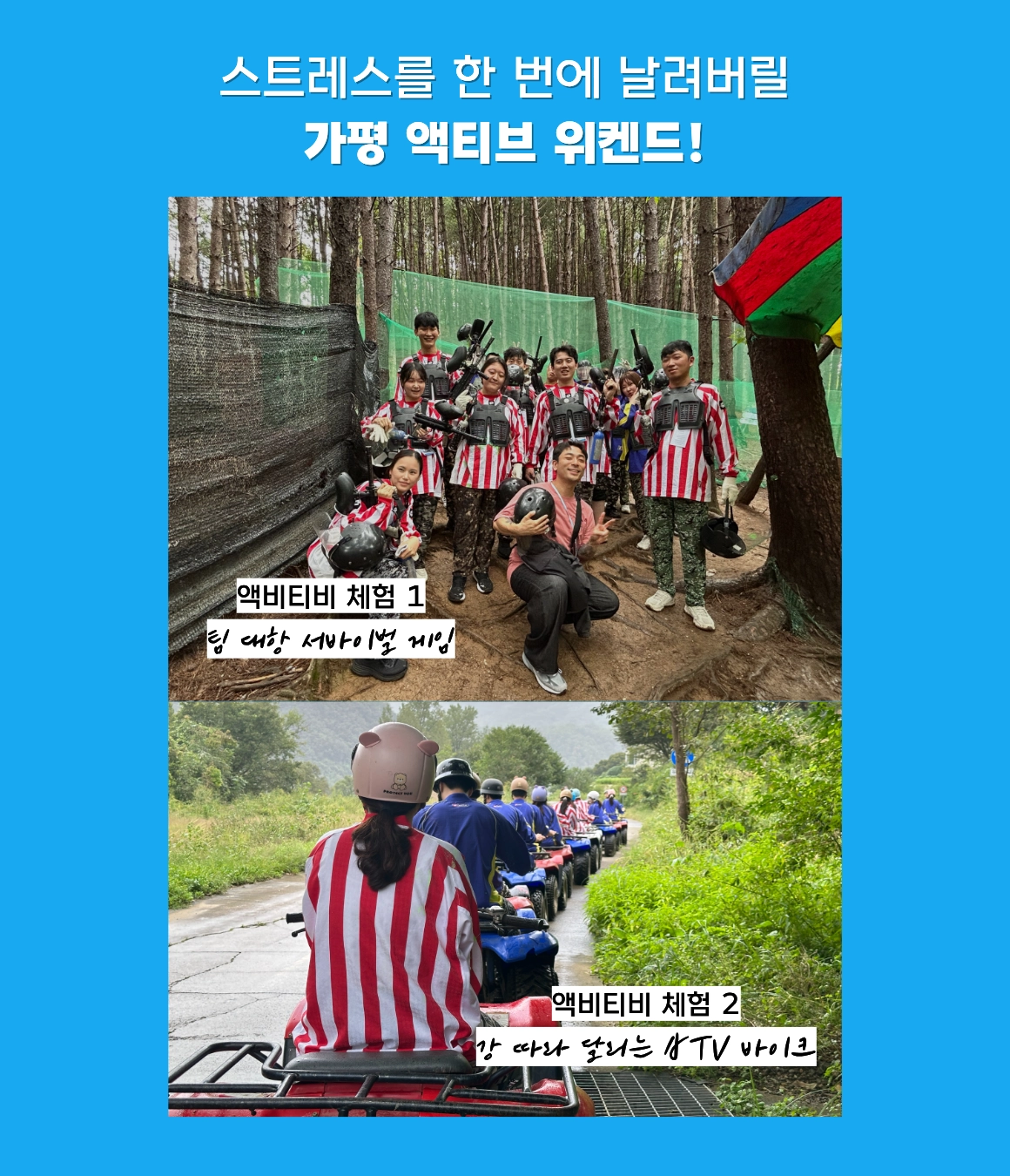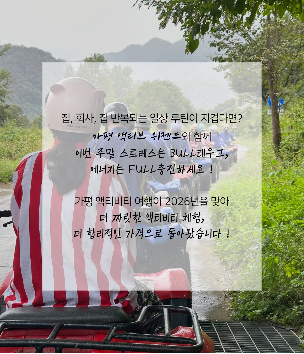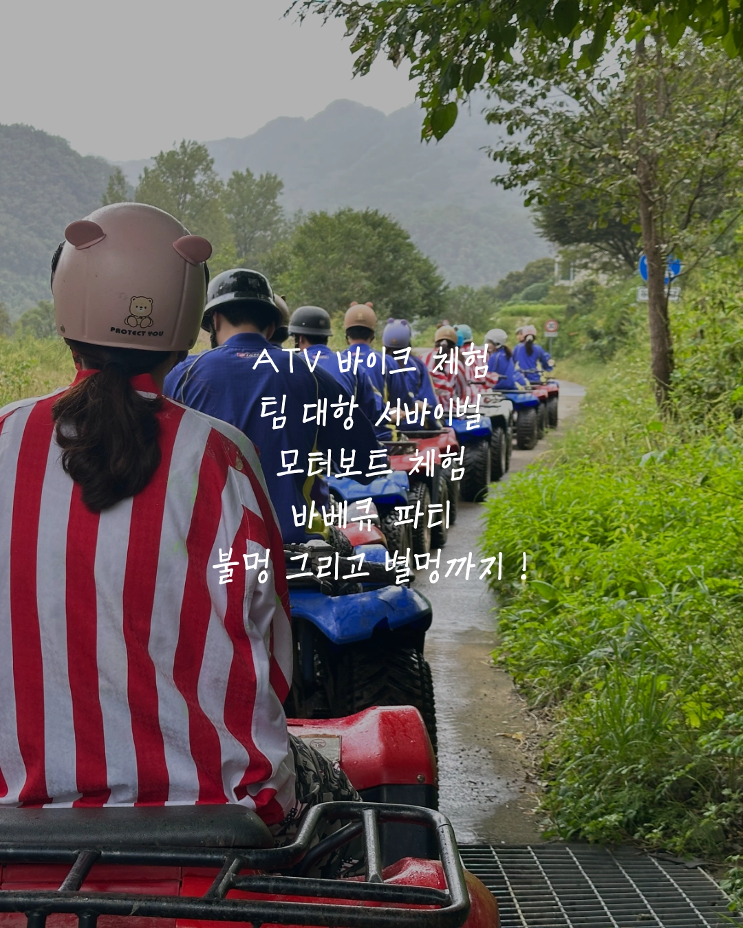 ๋น๊ฐ ์ฌ ๊ฒฝ์ฐ์๋ ์งํํ๋ฉฐ, ATV๋ฐ์ดํฌ, ์๋ฐ์ด๋ฒ ๊ฒ์ ์งํ ์ ์ฐ๋น๋ฅผ ์ง๊ธํด๋๋ฆฝ๋๋ค.