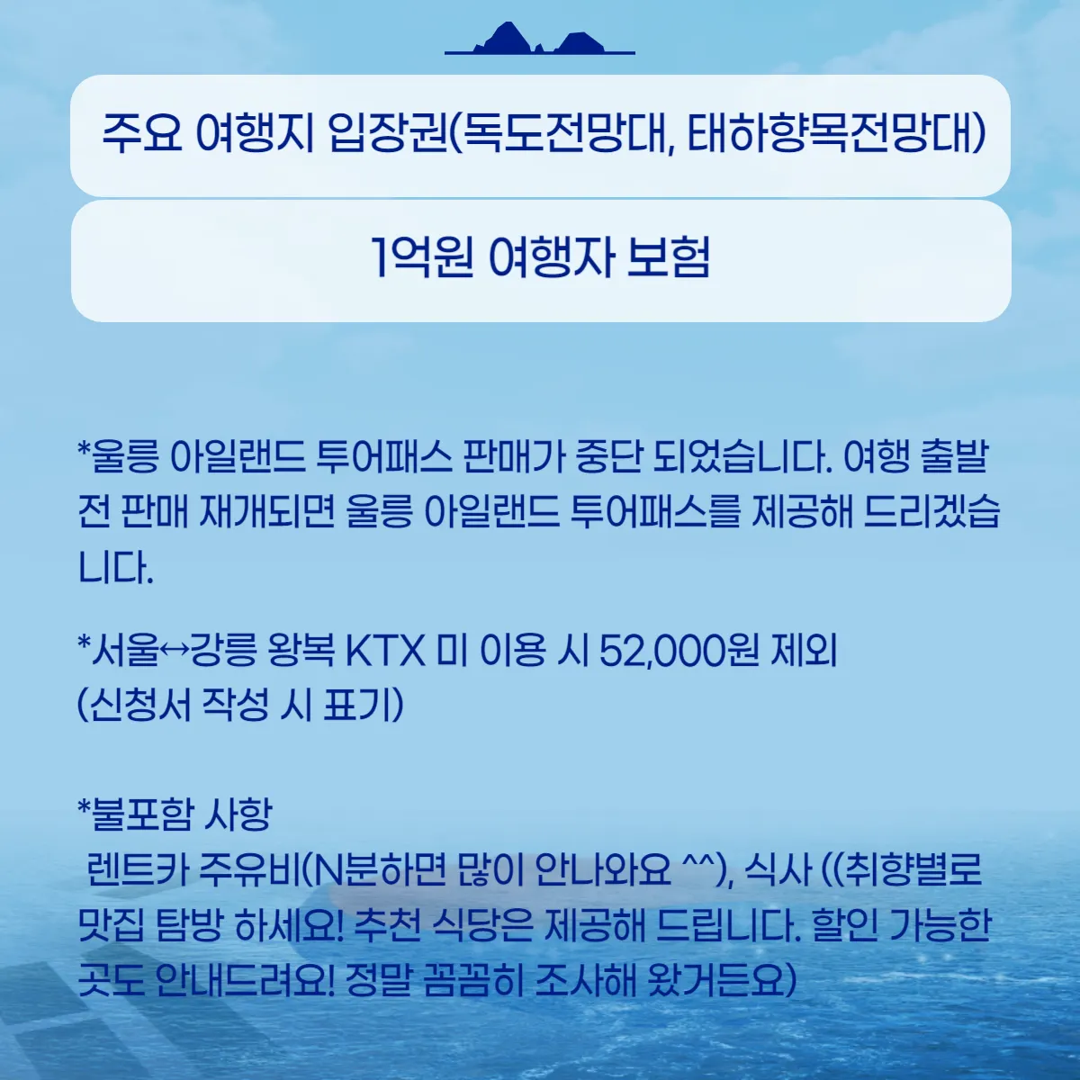 ๋ํ ๋ฐฐํธ(VIP์), ์์ 2๋ฐ(2์ธ~6์ธ1์ค, 2์ธต ์นจ๋, ๋ฐฉ๋ง๋ค ํ์ฅ์ค ๋ณด์ , 6์ธ์ค์ ํ์ฅ์ค 2๊ฐ), ๋ ํธ์นด 4์ธ1๋(์์ฐจ๋ณดํ ํฌํจ), ์์ธ<->๊ฐ๋ฆ ์๋ณต ktxํ, ์ฃผ์ ์ฌํ์ง ์