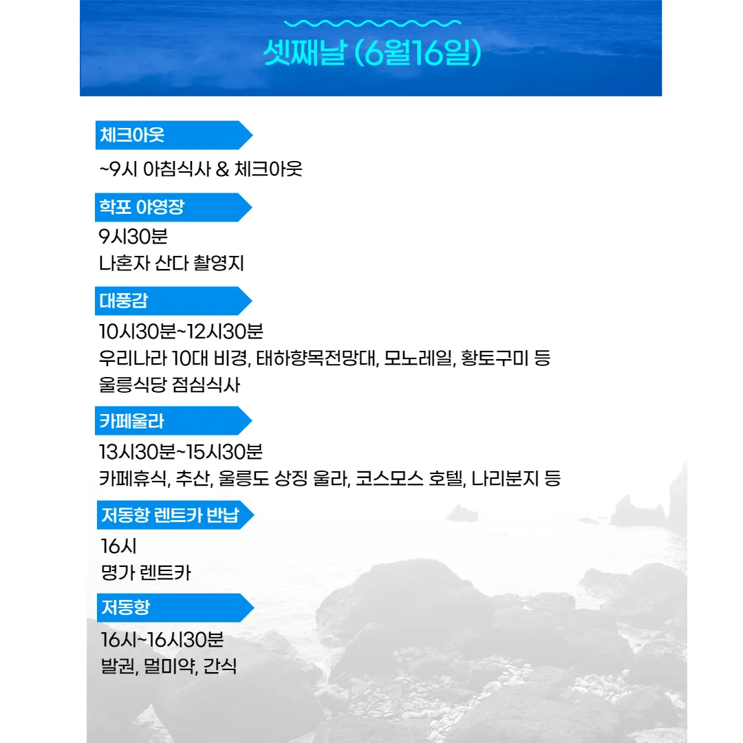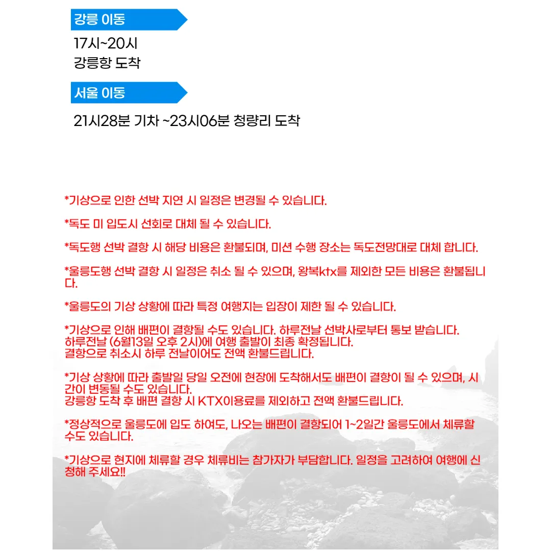 6์16์ผ(์ผ) 17์ ์ ๋ํญ ์ถ๋ฐ โ 20์ ๊ฐ๋ฆํญ ๋์ฐฉ 21์28๋ถ ๊ฐ๋ฆ์ญ KTX โ 23์06๋ถ ์ฒญ๋๋ฆฌ์ญ ๋์ฐฉ