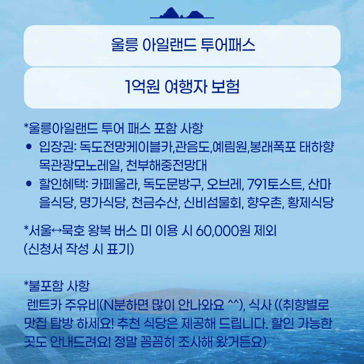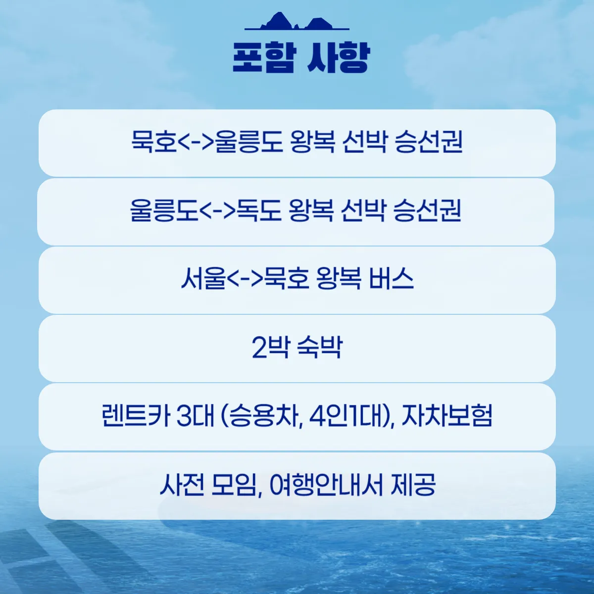 ๋ํ ๋ฐฐํธ(์พ์์ ), ์์ 2๋ฐ(4์ธ~6์ธ1์ค, ์จ๋๋ฐฉ, ๋ฐฉ๋ง๋ค ํ์ฅ์ค ๋ณด์ ), ๋ ํธ์นด 4์ธ1๋(์์ฐจ๋ณดํ ํฌํจ), ์์ธ<->๋ฌตํธํญ ์๋ณต ๋ฒ์คํ(์กฐ์ํฌํจ), ์ฃผ์ ์ฌํ์ง ์